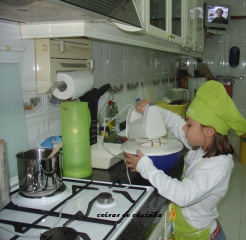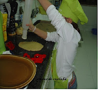 Aqui a neta com o seu avental e chapéu!!!!a estender a massa!