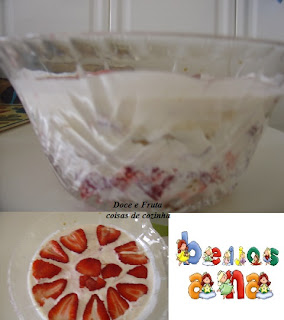 Numa taça(eu faço numa redonda)coloque as bolachas embebidas,um pouco de creme,um pouco de molho de morango,uns morangos crus fatiados.
