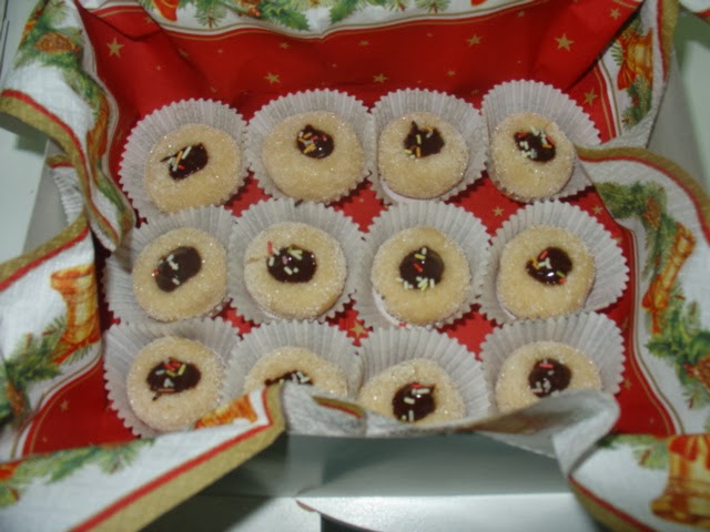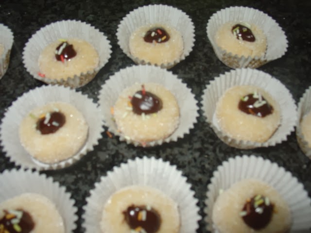 Com as mãos polvilhadas com açúcar faça bolas e faça uma cavidade no meio para colocar o chocolate.